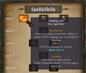 You can easily assign an attack or spell to your right mouse button. Open your Skill Page by pressing the associated icon in the bottom interface or simply hitting the K key. Left click on the spell you want to set and it will be mapped to your right mouse button. You can also assign a hot key to any of your "Active" spells by placing the mouse cursor over the spell and pressing F1 – F12. This will bind that spell to that key, allowing you to call it up instantly as your right mouse button skill.